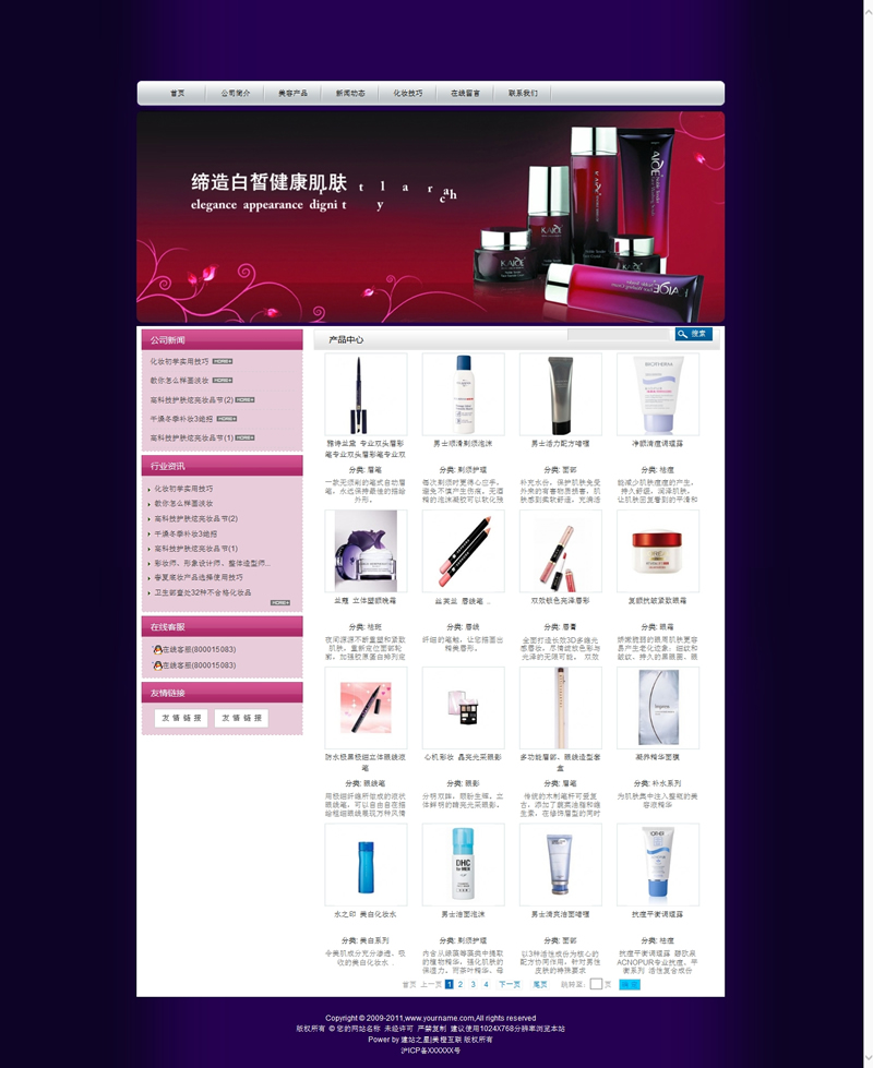 模板編號(hào):     S1182 紫色多彩化妝用品美容護(hù)膚品建站公司模板