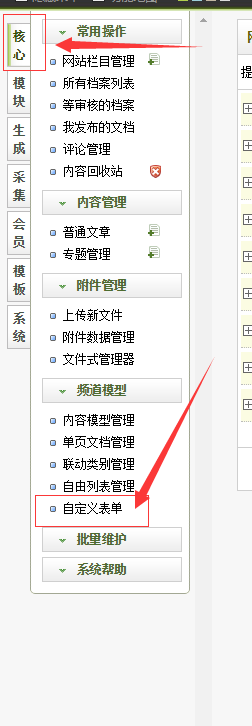 1、在“后臺——核心”部分的“頻道模型”選項卡下找到并點擊“自定義表單”選項: