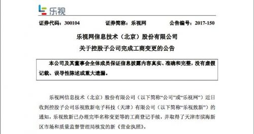樂視網(wǎng)體現(xiàn),已收到控股子公司樂視致新電子科技(天津)有限公司(簡稱“樂視致新”)的通知,樂視致新已管理完畢名稱變換等的工商登記手續(xù),并取得了天津市濱海新區(qū)市場和質(zhì)量監(jiān)督辦理局核發(fā)的新《營業(yè)執(zhí)照》。