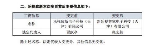 變換后,公司名稱為新樂視智家電子科技(天津)有限公司(簡稱“新樂視智家”),注冊本錢為31,245. 2712 萬元,公司法定代表人由賈躍亭變換為張志偉。公告提到,除名稱、法定代表人變換外,公司其他信息無變革。