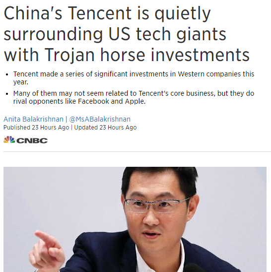 新浪美股訊 北京時(shí)間 12 月 4 日凌晨消息,據(jù)CNBC稱,中國的騰訊正暗暗圍繞著美國科技巨頭進(jìn)行一項(xiàng)特洛伊木馬投資計(jì)劃。騰訊本年在西方進(jìn)行了一系列重大投資,被投資對(duì)象多數(shù)似乎與騰訊的核心業(yè)務(wù)并無關(guān)聯(lián),但其實(shí)是為了與Facebook和蘋果等對(duì)手展開競(jìng)爭。