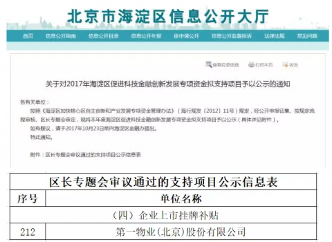 近日,北京市海淀區(qū)金融辦對(duì)“ 2017 年海淀區(qū)促進(jìn)科技金融創(chuàng)新發(fā)展專項(xiàng)資金擬支持項(xiàng)目”予以公示,第一物業(yè)契合海淀區(qū)科技金融創(chuàng)新中心建設(shè)的定位,符合科技創(chuàng)新與金融創(chuàng)新相結(jié)合的特征,成功申領(lǐng)了促進(jìn)科技金融創(chuàng)新發(fā)展專項(xiàng)激勵(lì)資金 50 萬(wàn)元,為企業(yè)創(chuàng)新升級(jí)提供了助力。