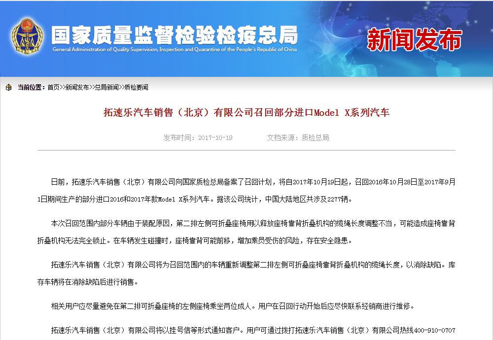 據國家質檢總局網站消息,,日前,拓速樂汽車銷售(北京)有限公司向國家質檢總局存案了召回計劃,將自 2017 年 10 月 19 日起,召回 2016 年 10 月 28 日至 2017 年 9 月 1 日期間生產的部分進口 2016 和 2017 年款Model X系列汽車。據該公司統計,中國大陸地區共涉及 2277 輛。