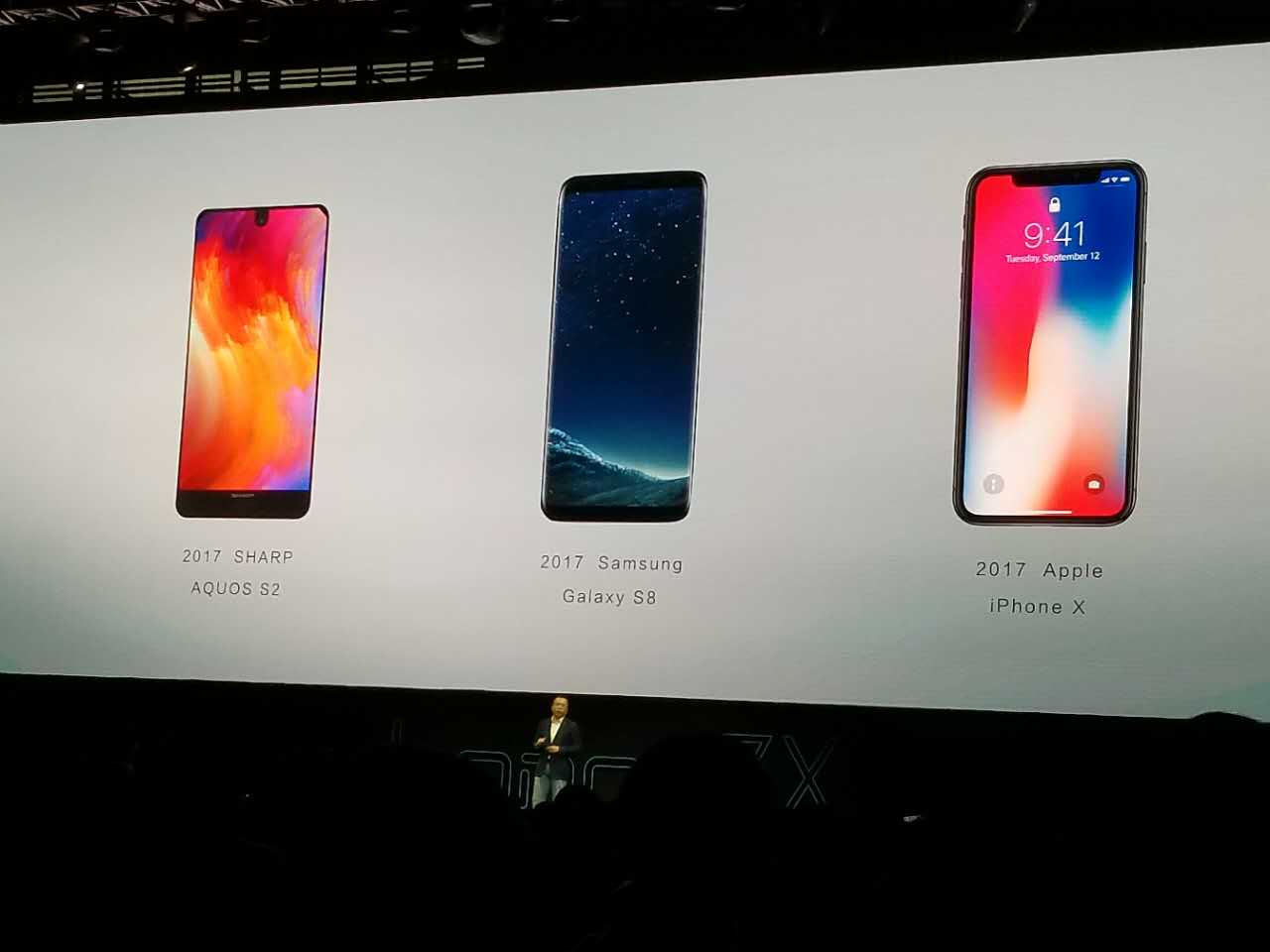 隨后,趙明展示了目前市面上三種代表性全面屏手機,即夏普美人尖AQUOS S2、三星Galaxy S8 和iPhoneX。后兩款年度旗艦全面屏手機科技力滿滿,自不必多言,但從手機屏幕進化史的角度來講,夏普美人尖AQUOS S2 的意義更勝一籌。