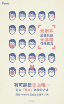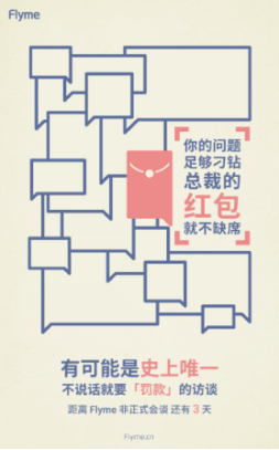 主打拒絕套路的Flyme非正式會談確實很有看點,這從倒計時海報中即能感受到。 3 天倒計時海報透露:“你的問題足夠刁鉆,總裁的紅包就不缺席”,并體現這“有可能是史上唯一不說話就要罰款的訪談”,以此鼓勵大家說真話,提出“刁鉆”問題,難倒了Flyme總裁楊顏,紅包就會現身。是不是夠新穎?