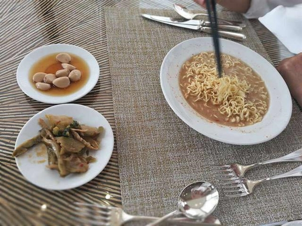 本來,這是一張馬云正在吃飯的圖,餐盤里裝的是便利面、咸菜和大蒜。