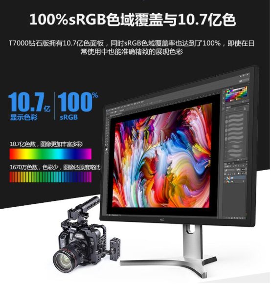 顯示器色域覆蓋越多,百分比數(shù)值越高,意味著其能顯示的色彩越豐富,效果自然更好。對(duì)于普通的用戶來說,一般顯色能力的屏幕能夠涵蓋的sRGB色域已經(jīng)足夠我們使用。但是,對(duì)于專業(yè)用戶而言,擁有一臺(tái)像HKC T7000鉆石版超廣色域?qū)I(yè)顯示器,是工作必不成少的工具。