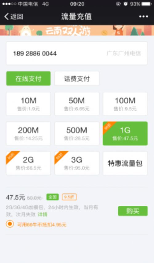 用戶可以用手機微信關注“天翼用戶中心”公眾號,在公眾號內充值就可以參與抽獎活動。大獎包孕“七彩云南六天五晚品質雙人游VIP旅游卡”、“iPhone7”和“10- 500 牛幣”?,F在牛幣還可以抵扣充值金額使用(抽獎活動和流量寶活動可獲得牛幣),“天翼用戶中心”給用戶提供快速賬單查詢辦事,還可以便捷的充值話費、流量、固話、寬帶等,更會不按期的推出各種充值折扣優惠活動。