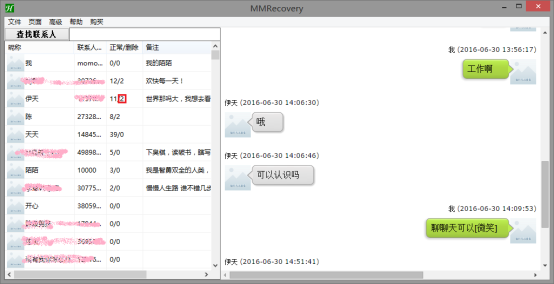 如下圖,雙擊左側陌陌聯系人,右側將會顯示當前聯系人的聊天記錄,圖中紅色方框中的“2”體現恢復出來的已被刪除的聊天記錄的數量。