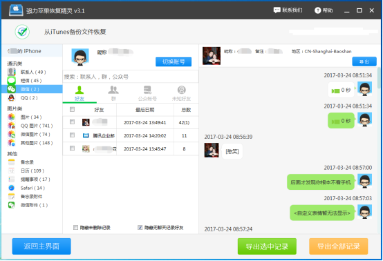 4、掃描完成之后,在界面左側點擊“微信”一欄,旁邊就會顯示有賬號以及好友列表,點擊列表中的好友右側都顯示詳細的微信聊天記錄,在其中找到之前誤刪的勾選上,之后點擊“導出選中記錄”按鈕,軟件就開始恢復選中的微信聊天記錄了。