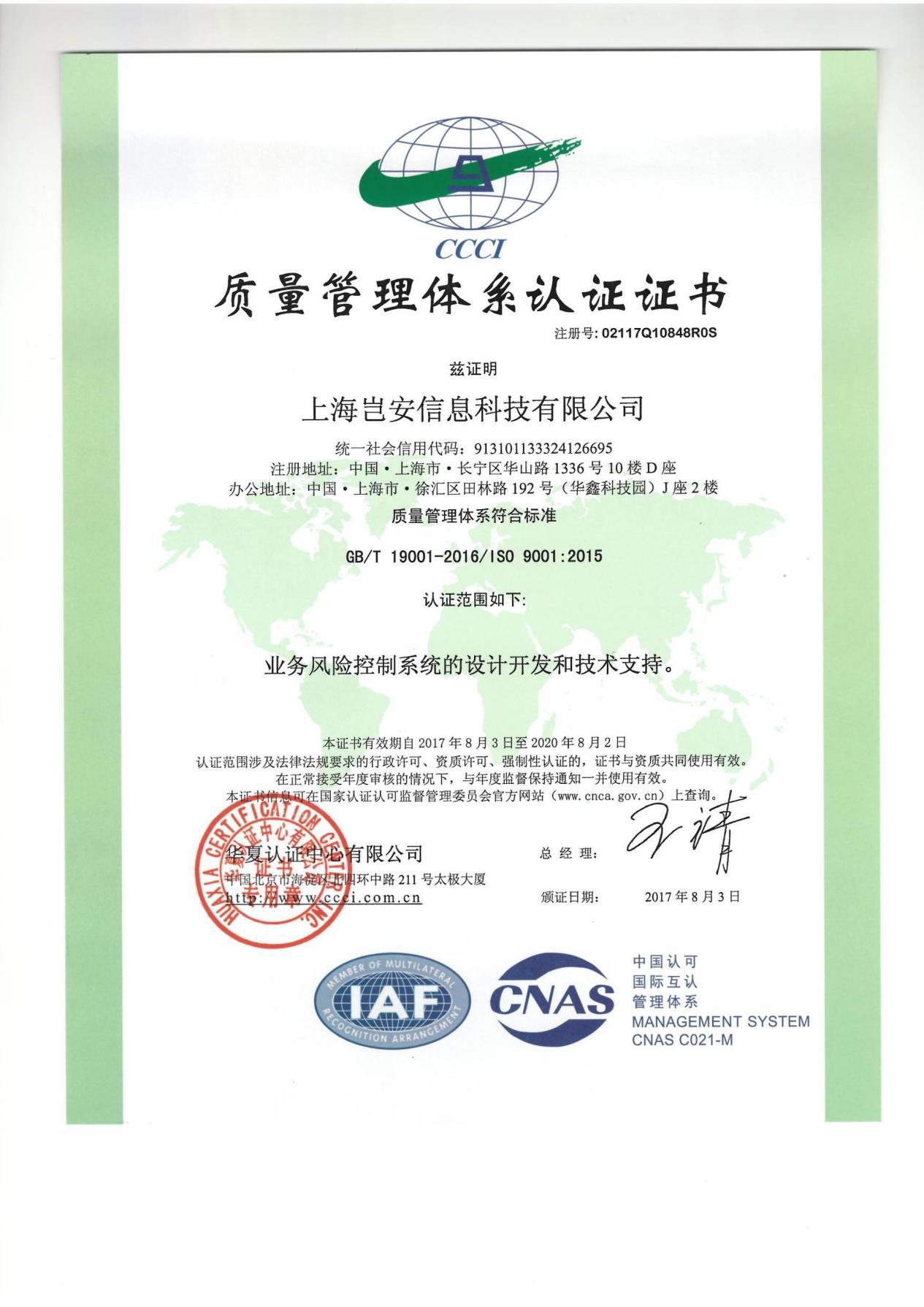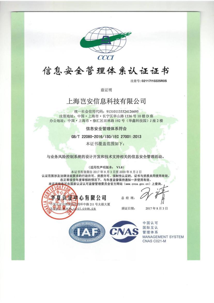 ISO27001 作為目前國際上具有代表性的信息安適辦理體系尺度,采用以風險辦理為核心的方法來辦理公司和客戶信息,并通過按期評估風險和控制辦法的有效性來保證體系的持續運行。 什么是ISO 9001? ISO 9001 是迄今為止世界上最成熟的質量框架,全球有 161 個國家/地區的超過 75 萬家組織正在使用這一框架。ISO 9001 不但為質量辦理體系,也為總體辦理體系設立了尺度。凡是通過認證的企業,在各項辦理系統整合上已達到了國際尺度,表白企業能持續不變地向顧客提供預期和滿意的合格產品。 上海豈安信息科技有限公司(簡稱“豈安科技”),專注于為企業提供互聯網業務風控解決方案。所辦事的行業覆蓋互聯網金融、銀行、電商、政府、航旅、互娛等諸多領域,為企業解決發展過程中與業務、交易、用戶相關的安適問題,,并提供完善的業務風控產品、技術和辦事。豈安科技是國內首家專注業務風險控制的辦事供應商,由來自PayPal、支付寶、Cisco、攜程、網易的反欺詐、安適技術專家團隊創立,并擁有自主知識產權的一系列核心產品。我們的核心團隊基于多年對黑灰產業鏈的情報收集、深入研究,透過用戶行為分析,結合大數據模型,針對各類風險建立了一整套由數據驅動的風控技術體系。核心解決方案包孕大數據風控預警云平臺、終端設備信息收集管控系統、實時流量日志風險分析決策系統等。 除了以上雙向安適認證。未來,豈安科技還將持續為互聯網線上業務安適保駕護航,通過技術和數據手段為企業提供更多的業務安適辦事。 豈順產品優勢主要表現在: 安適:豈安的產品在設計之初所遵循的一個原則是保障客戶的數據安適,不能解決了一個問題而帶來新的安適隱患,不以業務安適為由索取用戶的敏感業務數據。 快速:客戶的業務總是在飛速發展,傳統風控的模式需要大量的業務研發資源配合,豈安的風控系統以最小的代價進行快速安排,不必牽涉客戶業務研發的大量精力,項目周期可控。 高效:利用更少的資源更快更安適的滿足客戶的需求,但效果會不會打折扣?相反,豈安的產品具備多項自主創新機制,比起傳統解決方案能夠發現并解決更多的問題。