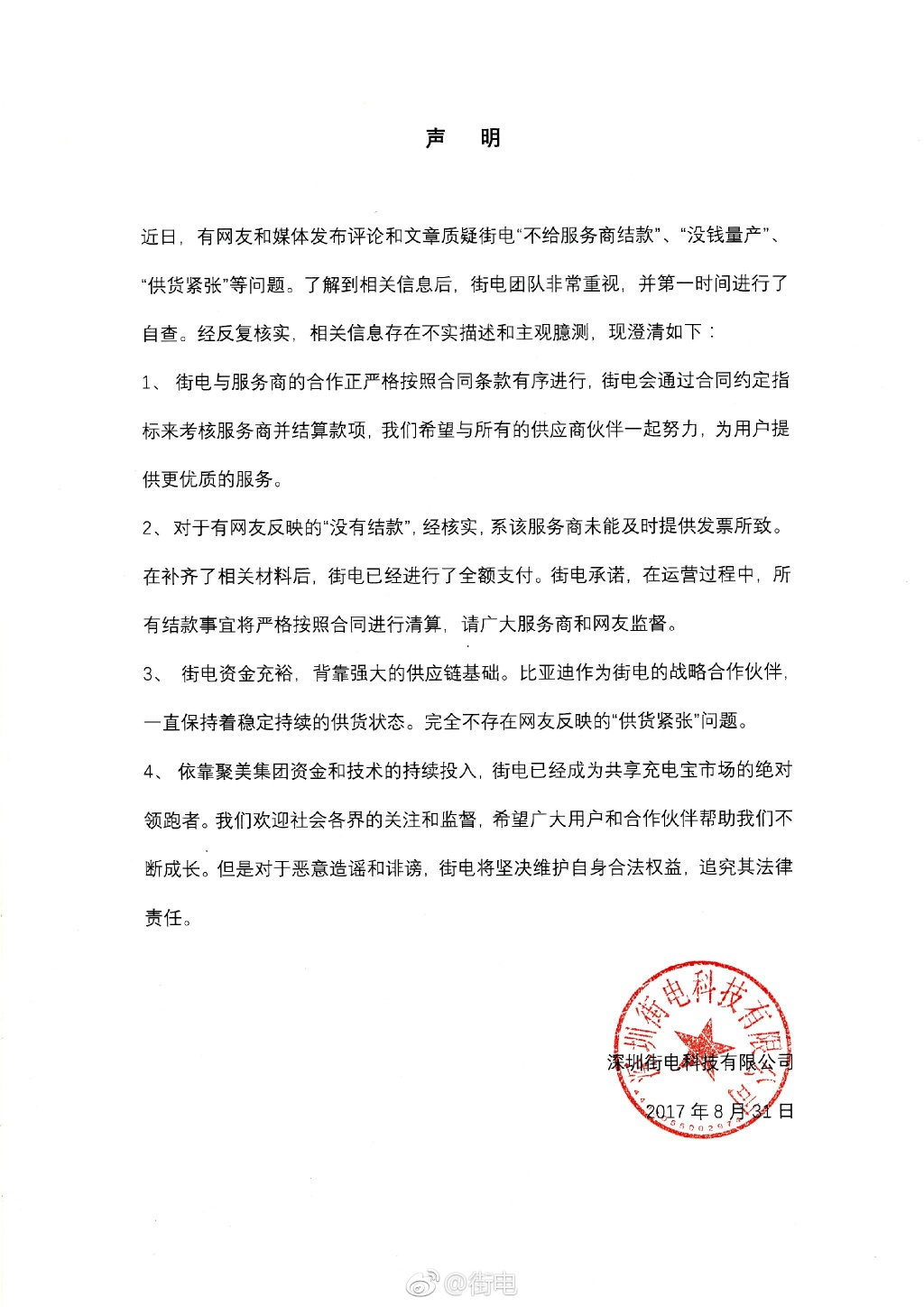 站長(zhǎng)之家(Chinaz.com) 8 月 31 日 近日,有消息稱(chēng)共享充電寶公司街電科技出現(xiàn)“不給辦事商結(jié)款”、“沒(méi)錢(qián)量產(chǎn)”、“供貨緊張”等問(wèn)題。對(duì)于該傳聞,街電官方做出了解釋。