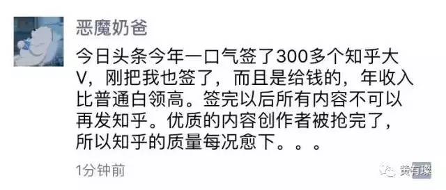 近日,一張惡魔奶爸的伴侶圈截圖開始大量在圈內流傳,提及頭條正在大面積以簽約付費且排它的形式“挖”走知乎的站內大V。