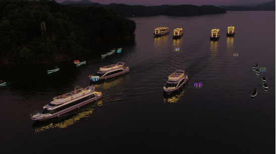 象征仙女湖七仙女的燈籠形狀無人機(jī)在湖面上結(jié)伴飛行