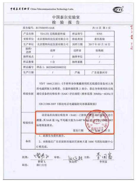 而具體的SAR陳訴長這樣,紅框里就是檢測的SAR值,這款搜狗家的兒童產品糖貓SAR值是0.4872W/kg,遠低于2W/kg的尺度,所以是沒問題的。