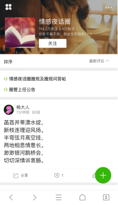 目前,在QQ瀏覽器話題圈的情感話題分類下,人氣最旺的“情感夜話圈”關(guān)注人數(shù)已超百萬,而除了情感話題,還有搞笑、文學、二次元、游戲、影視等滿足年輕用戶興趣需求的話題圈。據(jù)官方公布數(shù)據(jù)顯示,QQ瀏覽器已經(jīng)擁有 2 萬多個差別的話題圈子,參與用戶主要來自90、 95 后年齡段的年輕人。