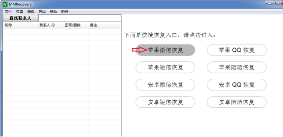 首先運行恢復工具MMRecovery,如下圖在右側快捷恢復入口,點擊 “蘋果微信恢復 ”按鈕,將會彈出“微信恢復向導”對話框。