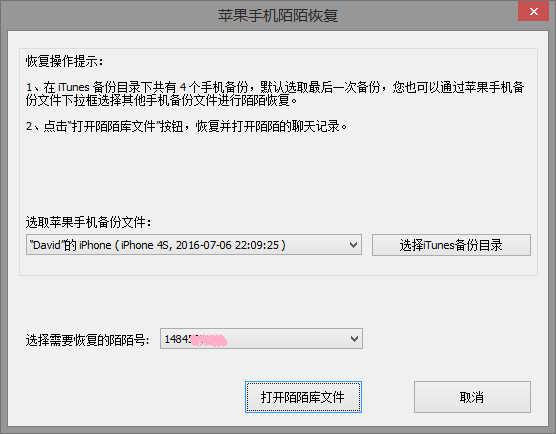 在“蘋果手機陌陌恢復”對話框中,如下圖點擊“打開陌陌庫文件”按鈕,就能查看需要恢復陌陌號的聊天記錄了。如果有多個陌陌號,可以通過陌陌號的下拉框進行選擇。