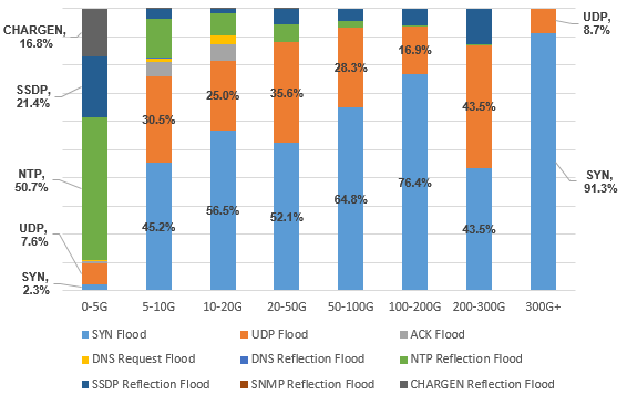 特別值得注意的是,SYN Flood大流量攻擊明顯增多,其在大流量攻擊中占比明顯上升。尤其在大于300Gbps的超大流量攻擊中,SYN Flood占比高達91.3%,比擬去年增長了52. 3 個百分點。