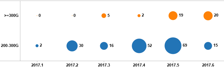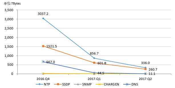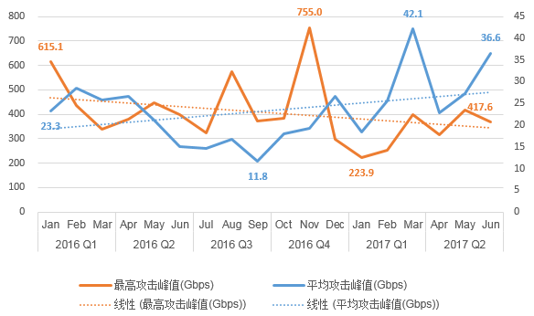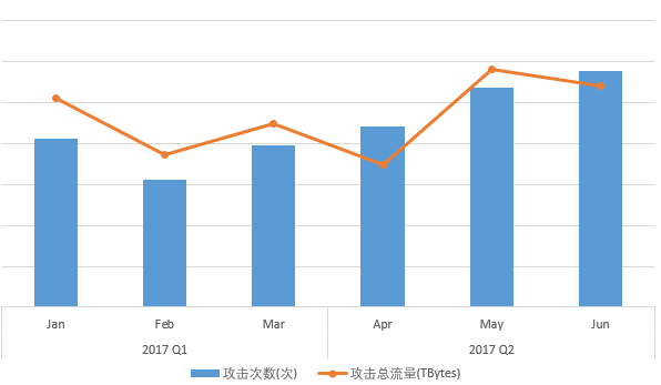2017 年上半年,300Gbps的超大流量DDoS攻擊呈增長趨勢,共發生 46 次, Q2 比Q1 增加了720%