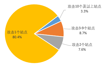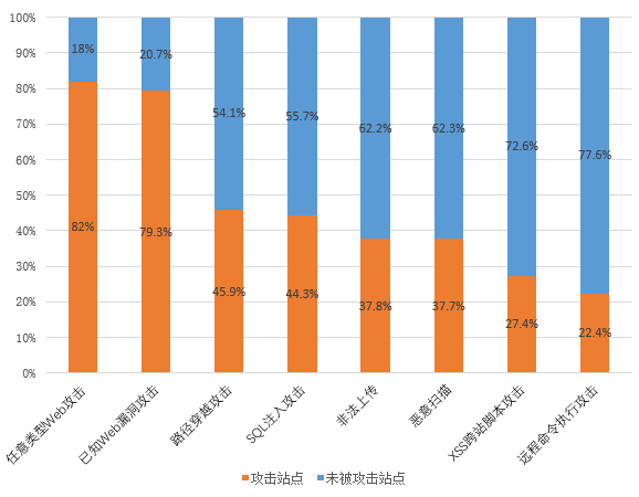 2017 上半年,攻擊者對NSFOCUS所防御的Web站點發起了2, 465 萬次Web應用層攻擊。其中有82%的網站在 2017 上半年曾遭受Web應用攻擊,單個站點日平均被攻擊次數為 21 次。