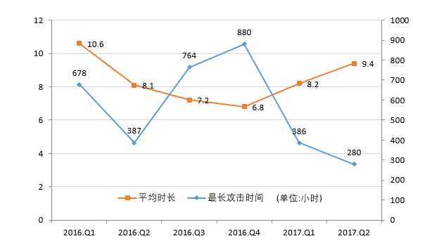 2017 上半年,長時攻擊增多,短時攻擊略有下降,但仍然占主導地位。單次DDos攻擊平均攻擊時長為 9 小時,,比擬 2016 年下半年呈回升趨勢,增長28.6%。