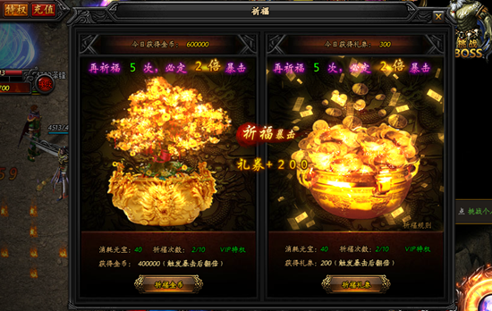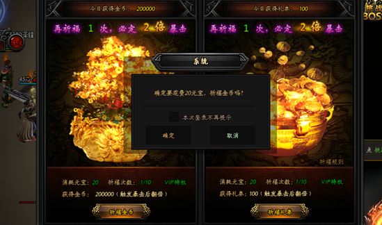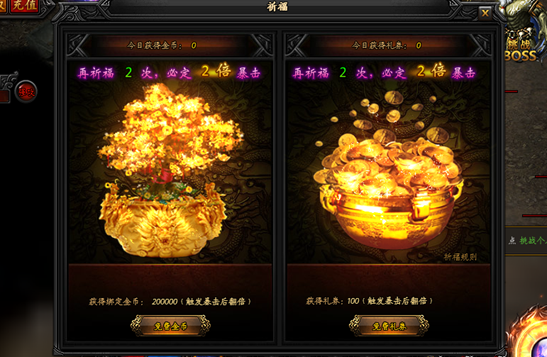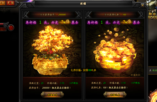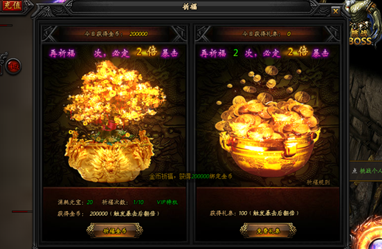 雖然花費多了,獎勵也直接翻了 1 倍。看來系統是為了鼓勵玩家多多祈福,增加收入。如果再出發 1 次暴擊,那么 400000 綁金直接就會釀成800000,禮金 200 直接變為400,只不過你我都未必舍得那么多的元寶來玩這樣一件事情。
