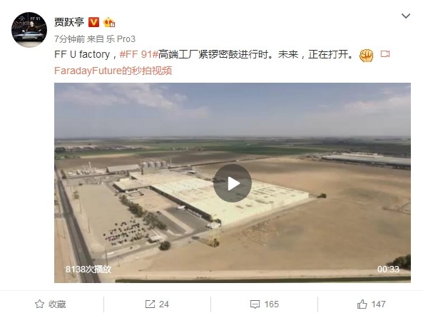 賈躍亭體現“#FF 91#高端工廠緊鑼密鼓進行時。未來,正在打開。”