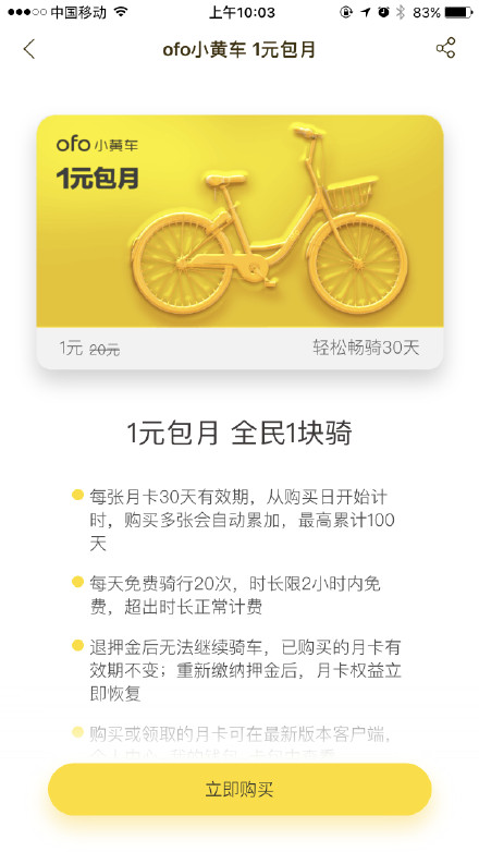 據了解,只要用戶打開ofo小黃車App,進入主頁面上的活動詳情頁,點擊“ 1 元 30 天”即可搶購 1 元暢騎 30 天的騎行月卡;新用戶只要完成注冊、押金繳納及身份認證后即可搶購。ofo小黃車 1 元月卡有效期為 30 天。此外,用戶在支付寶、滴滴、小米、餓了么、中國移動等app端,也可以領取 1 元包月卡。