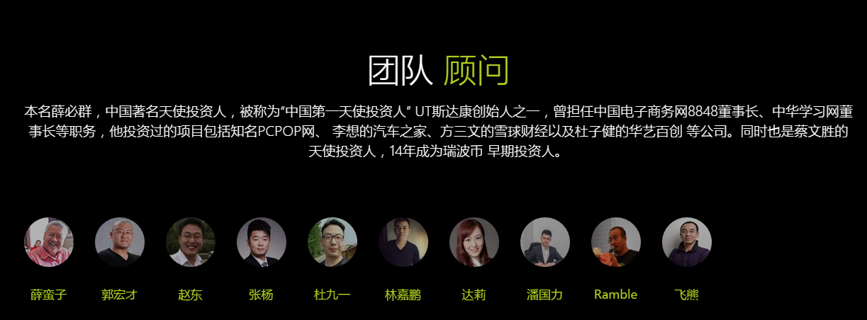 項目投資人更是圈內圈外赫赫有名的大咖。薛蠻子,中國著名天使投資人,投資過的項目包孕李想的汽車之家、方三文的雪球財經以及杜子健的華藝百創等公司。早在 2014 年就成為了瑞波幣早期投資人。郭宏才(寶二爺)比特幣(BTC)天使投資人,以太坊(ETH)初創公司天使投資人,區塊鏈領域活躍的參與人士,以及趙東、杜九一、飛熊等幣圈有名的數字貨幣投資人。