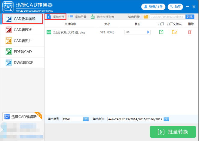 (1)點擊迅捷CAD轉換器的“CAD版本轉換”,然后點擊“添加文件”,完成文件的添加;