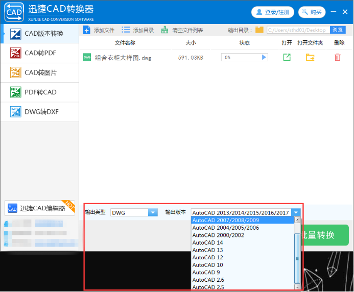 (2)文件添加完成后,不才方的設置區域可以設置將CAD文件的輸出版本,我們可以看到有十幾個版本可以進行選擇;