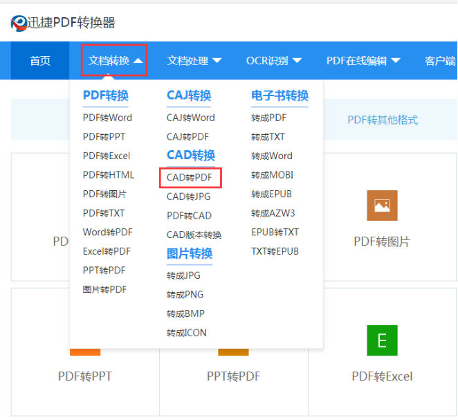 將鼠標移動到“文檔轉換”,點擊“CAD轉PDF”;