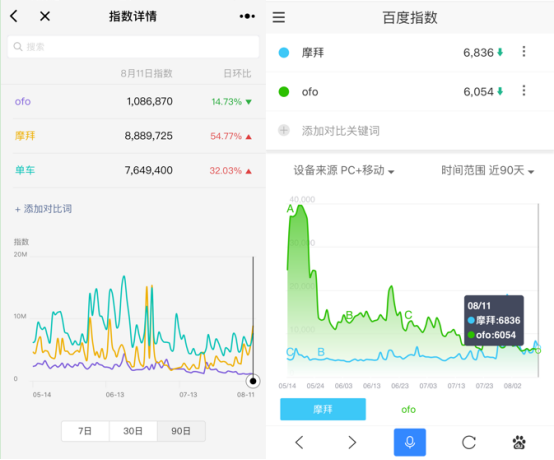 當前ofo發力在改裝智能鎖,摩拜頓時加大補助力度,對ofo新增用戶釜底抽薪。按照近90天微信指數顯示,摩拜在微信端一直大幅領先ofo,甚至在8月11日摩拜的品牌詞竟超過了“單車”的品類詞;別的在近90天的百度指數顯示,一直在輿論聲量上處于攻勢的ofo在8月份被摩拜小幅度反超。