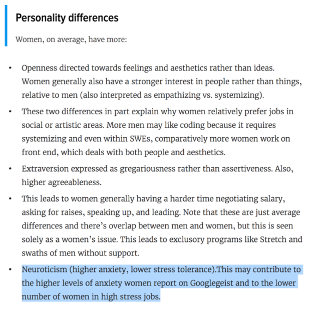 除了這種生理上的差距外,Damore在備忘錄中明確體現(xiàn)女性上更神經(jīng)質。其中包孕在職場上存在更大的不安,無法和男性肄業(yè)承擔工作壓力。