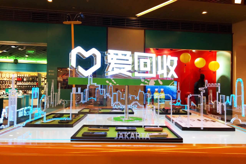 別的,愛回收嘉里中心環保辦事站還放設計了以亞克力為原材料勾勒出的大城市輪廓,并將有代表性的經典廢舊手機放置其中,它象征著在一線城市快節奏的生活影響下,被快速淘汰的大量廢舊電子產品。愛回收希望通過該裝置喚醒用戶對于環境污染的關注。與此同時,愛回收還將該店面內的觸摸詢價機調低后傾斜放置,增加嘉里城眾多兒童客群與愛回收之間的互動機會。