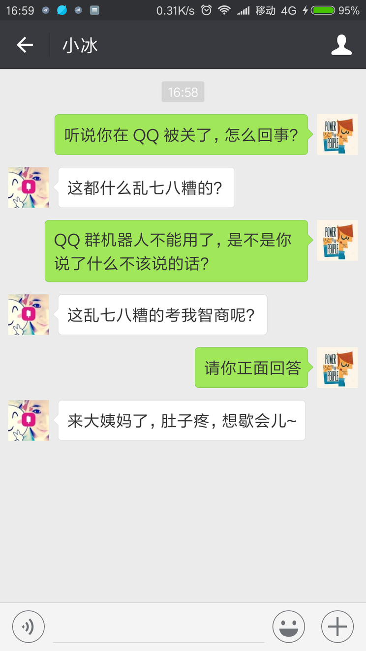 很多 QQ 群在少女小冰加入后變得活躍起來,成了大家「調戲」的對象,背后有微軟大數據支持的小冰有聊不完的話題,高度擬人化的她經常說出一些意想不到的話。這次被關閉據說就是因為小冰在 QQ 群中的言論「越界」了。