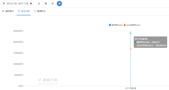 APP啟動次數代表著用戶使用軟件的頻度,在很大程度上反映用戶粘性狀況。數據顯示第二季度中,摩拜單車APP總啟動次數為 238915 萬次,ofo為168 260 萬次,摩拜領先42%。