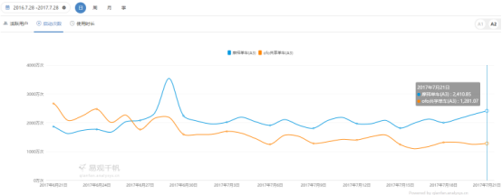 從APP周、季日啟動次數數據來看,摩拜發展態勢一致向好,而且發展速度比以往更加迅速。 7 月 21 日比來一天數據顯示,摩拜APP日啟動次數達到 2411 萬,ofo為 1281 萬。摩拜競領先88%,數據驚人。此外,, 6 月 21 日~ 7 月 21 日,摩拜APP日啟動次數單月走勢,從 1863 萬增長至 2411 萬,增幅為29%,ofo為從 2666 萬下滑至 1281 萬,降幅為52%,差距比較明顯。