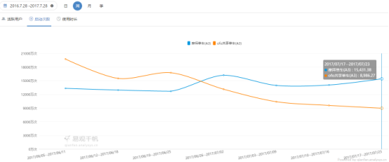 別的,APP周啟動次數指標中,摩拜優勢更加明顯。 7 月 17 日至 23 日,摩拜數據為 15431 萬,ofo為 8986 萬,摩拜領先多達72%。從 6 月 5 日至 11 日~ 7 月 17 日至 23 日APP周啟動次數雙月走勢來看,摩拜從 13334 萬增長至 15431 萬,增幅為16%,ofo從 19763 萬下滑至 8986 萬,降幅為55%。