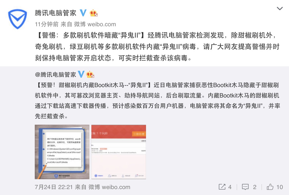 下載站的高速下載器一直是惡意木馬大規模傳播的溫床。近日,騰訊電腦管家攔截到了一個通過高速下載器大范圍傳播的惡性Bootkit木馬——“異鬼Ⅱ”,其通過知名刷機軟件——“甜椒刷機”、“奇兔刷機”、“綠豆刷機”感染電腦VBR(卷引導記錄),感染后使電腦淪為肉雞,具有篡改瀏覽器主頁、劫持導航網站、后臺刷流量等惡意行為特點,即使用戶重裝系統,也無法清除。目前,騰訊電腦管家已在第一時間查殺“異鬼Ⅱ”木馬,建議用戶及時處理。
