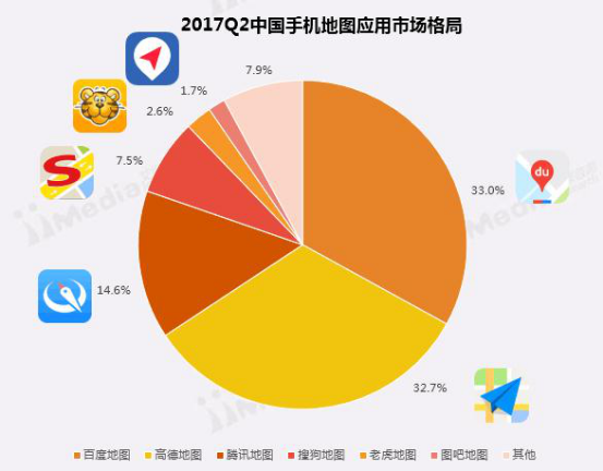 日前,著名市場調查研究機構艾媒咨詢發布了 2017 年第 2 季度中國手機地圖應用市場格局統計分析,數據顯示,百度地圖以33%的占比位居市場份額第一,其后是高德地圖(32.7%)、騰訊地圖(14.6%)、搜狗地圖(7.5%)、老虎地圖(2.6%)、圖吧地圖(1.7%)以及其他地圖(7.9%)。