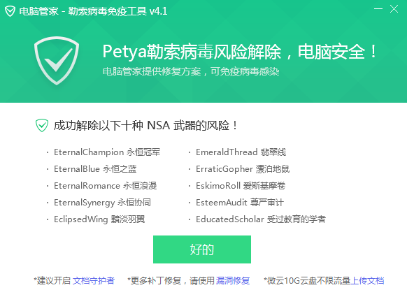 近期頻發的勒索病毒事件,讓文檔安適備受威脅,稍有失慎重要文檔就有將成為非法分子受眾的“人質”。基于早前應對勒索病毒的成熟經驗,騰訊電腦管家推出的“勒索病毒免疫工具”已經可以幫手用戶解除十種NSA兵器的風險,讓電腦免疫病毒感染,用戶也不必再擔心結業設計、重要研究數據等重要文檔被加密。