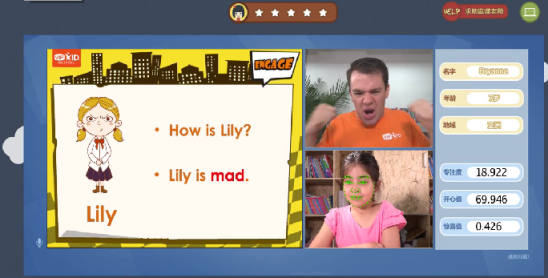 如今的在線英語課堂,正在呈現這樣的場景:老師在屏幕另一端做出了夸張的、模仿大象的動作,心領神會的孩子很快讀出了elephant這個單詞,而這一切發生的同時,平臺的面部識別系統正在不停地抓取孩子臉上83個數據點,分析孩子瞳孔和心情的變革,并在后臺實時顯示著孩子的專注度、開心值與驚喜值等量化數據,從而對整個教學效果進行評估……而這正是VIPKID將人工智能與教學過程融合的其中一項應用。