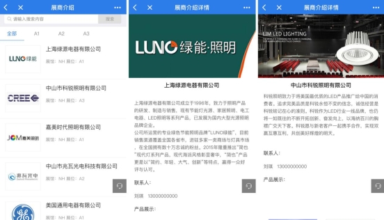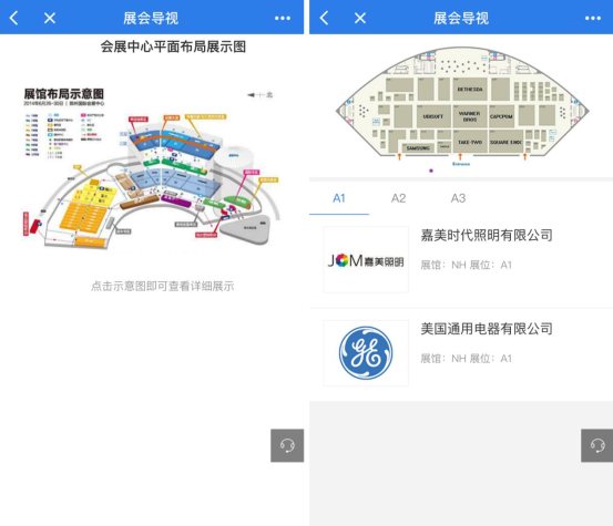 3.展會導視功能:展會舉辦所在的會展中心的布局示意圖,以及每個場館的展商平面分布圖。