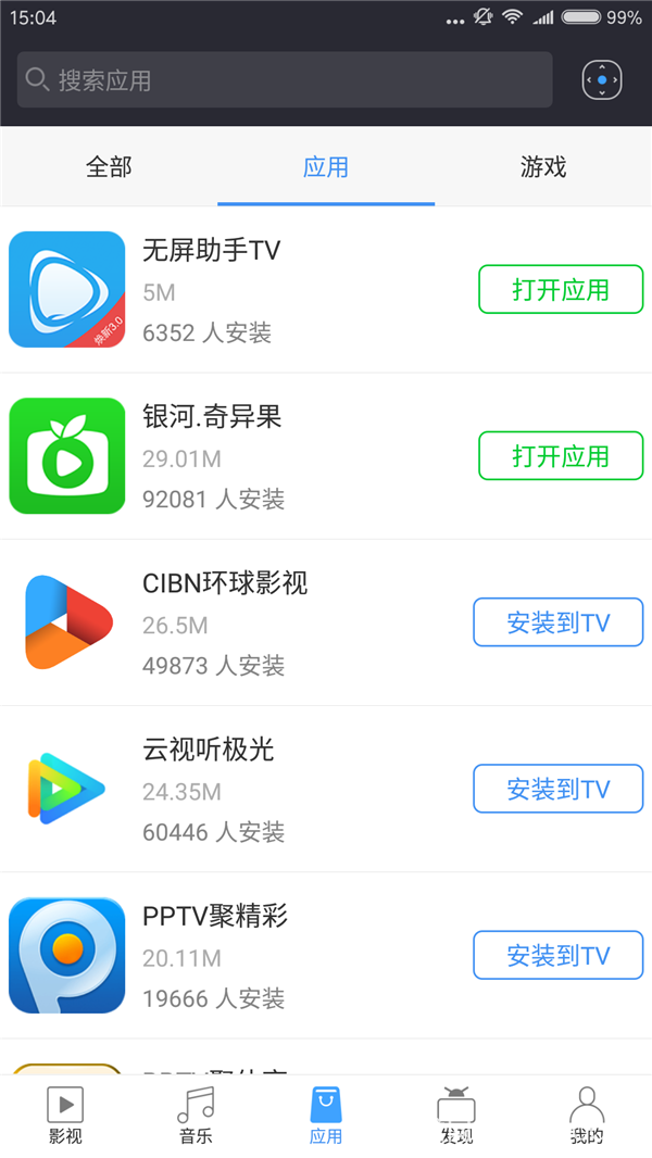 3、手機和極米無屏電視 H1S在同一wifi下連接,選擇應用,打開搜索應用