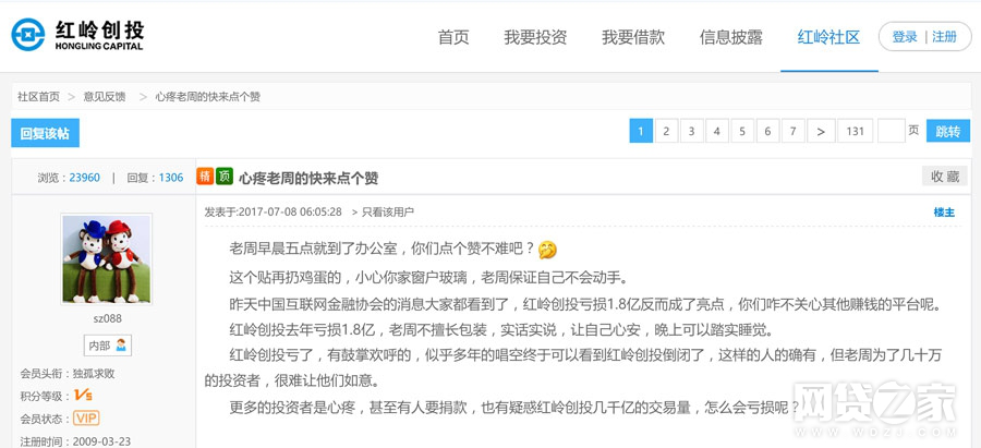 7 月 8 日,紅嶺創(chuàng)投董事長周世平在紅嶺社區(qū)發(fā)布帖子回應(yīng)外界關(guān)注的“紅嶺創(chuàng)投去年虧損1. 8 億”一事,并稱紅嶺創(chuàng)投本年利潤有望完成兩個(gè)億的目標(biāo)。