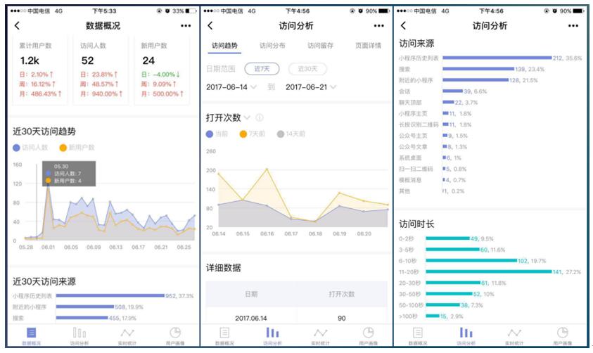 小程序數據助手:小程序商城運營者經過授權,即可通過“小程序數據助手”,隨時隨地查詢到已綁定小程序商城的用戶數據概況、拜候分析和實時統計等數據。