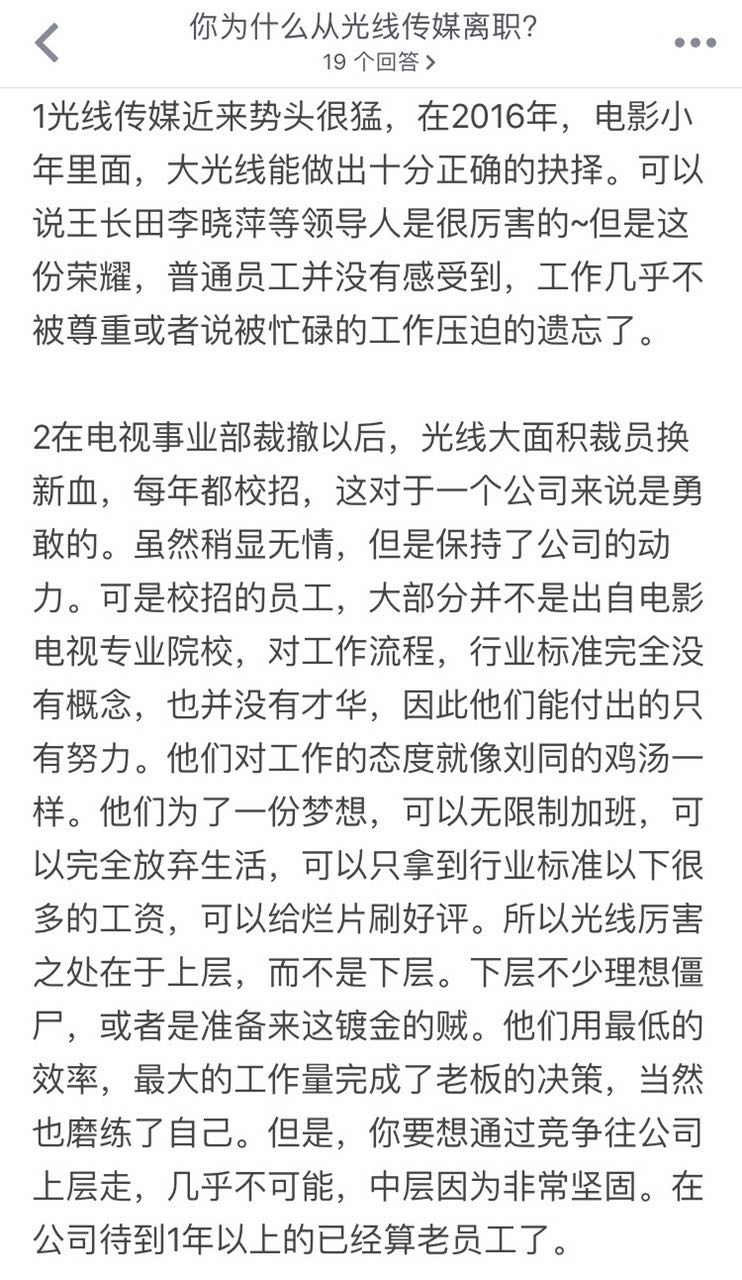 而知乎上也有疑是光線傳媒前員工的網友體現了關于對光線傳媒裁員的看法,“在電視事業部裁撤以后,光線大面積裁員換新血,每年都校招,這對于一個公司來說是勇敢的。雖然稍顯無情,但是連結了公司的動力。可是校招的員工,大部分并不是出自電影電視專業院校,對工作流程,行業尺度完全沒有概念,也并沒有才華,因此他們能付出的只有努力。”