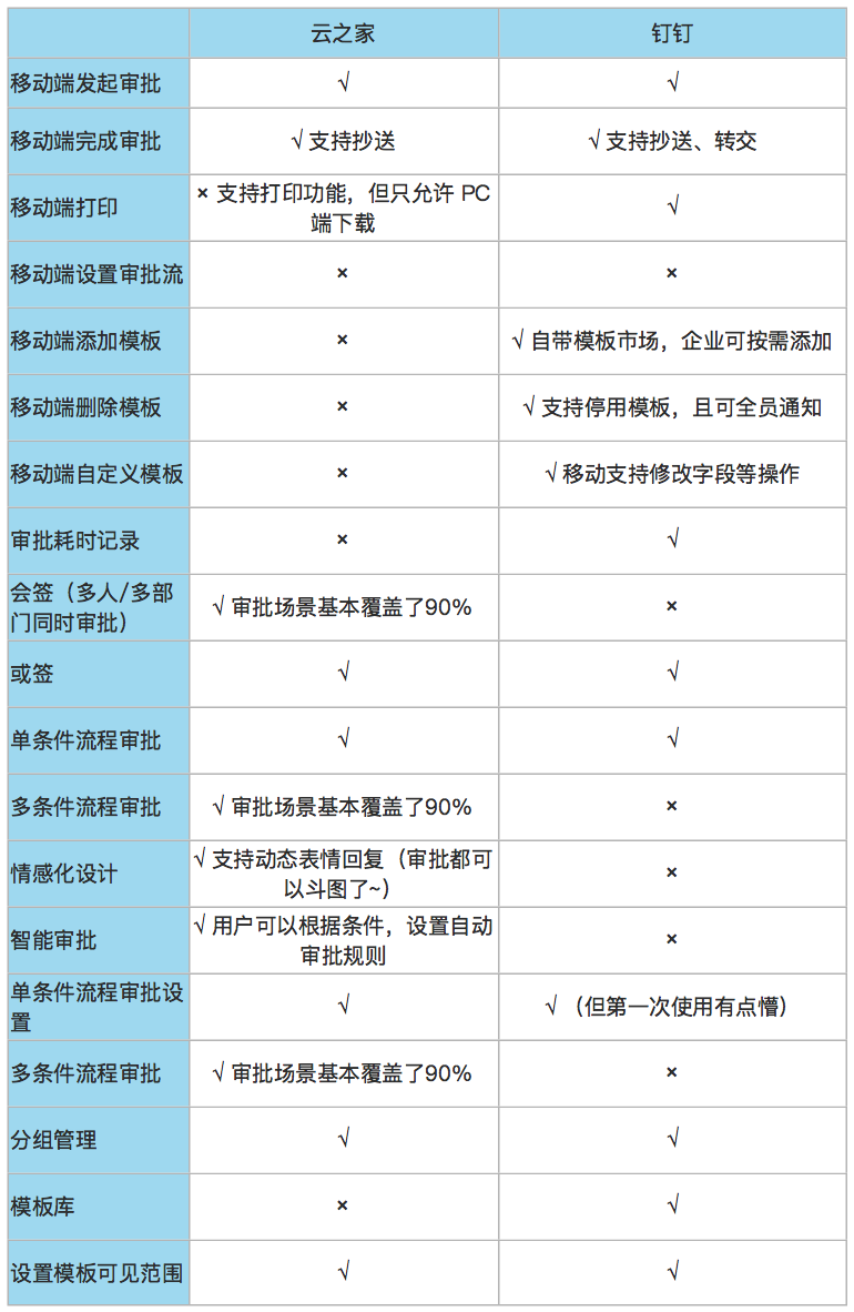 釘釘和云之家都在六月份舉辦了發布會。釘釘發布了3. 5 版本,標語是“酷公司,用釘釘”;云之家公布了V9 版本,提出了“凝聚信任,激活創造力”的標語。雙方特色總結如下:
